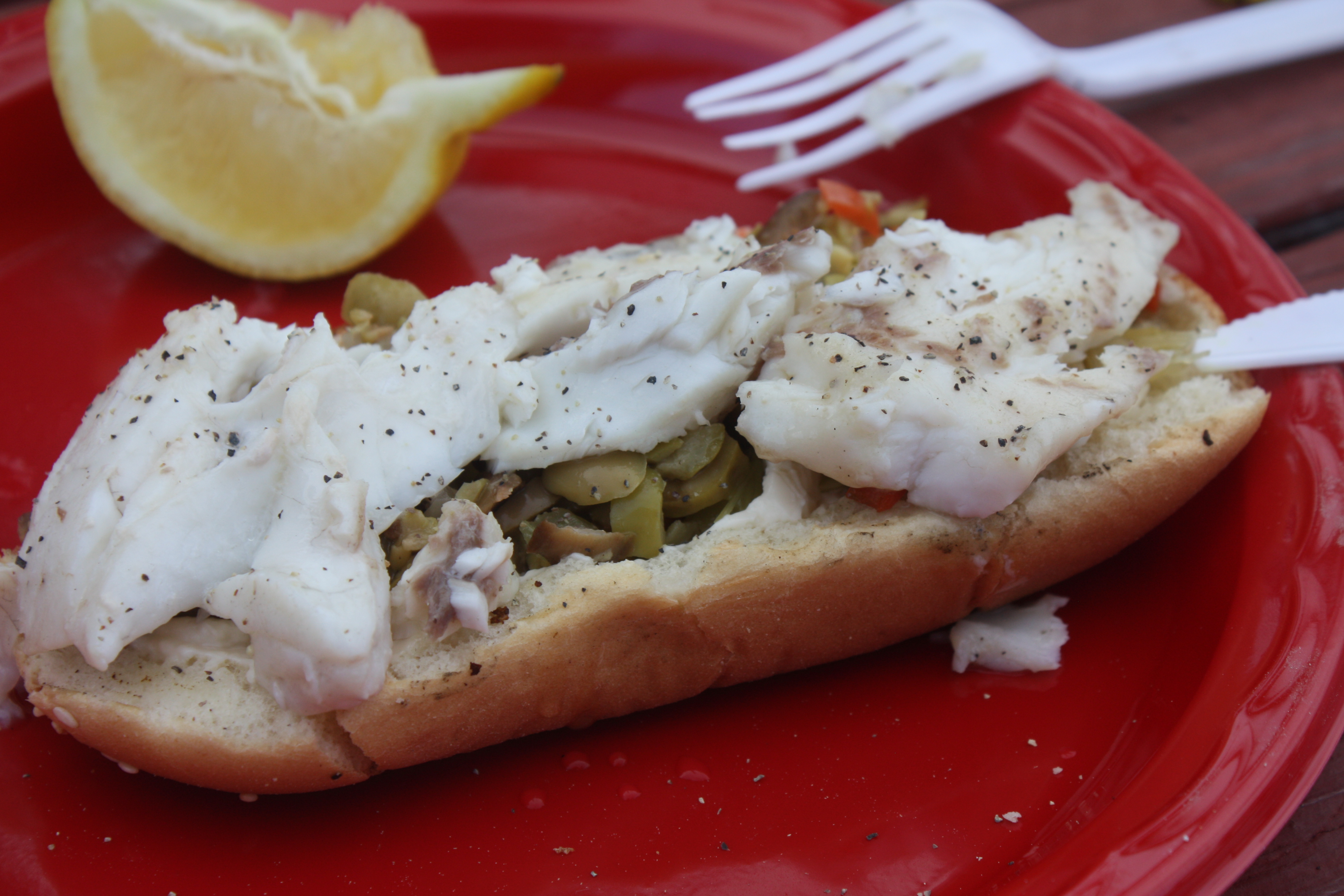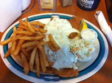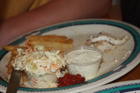 Resten av fisken ble behørig oppbevart i minibarene til dagen etter. Da tok vi den med til en restaurant i nærheten. De tilberete fisken for oss – og serverte den med masse pommes frites (selvfølgelig) og coleslaw:-)