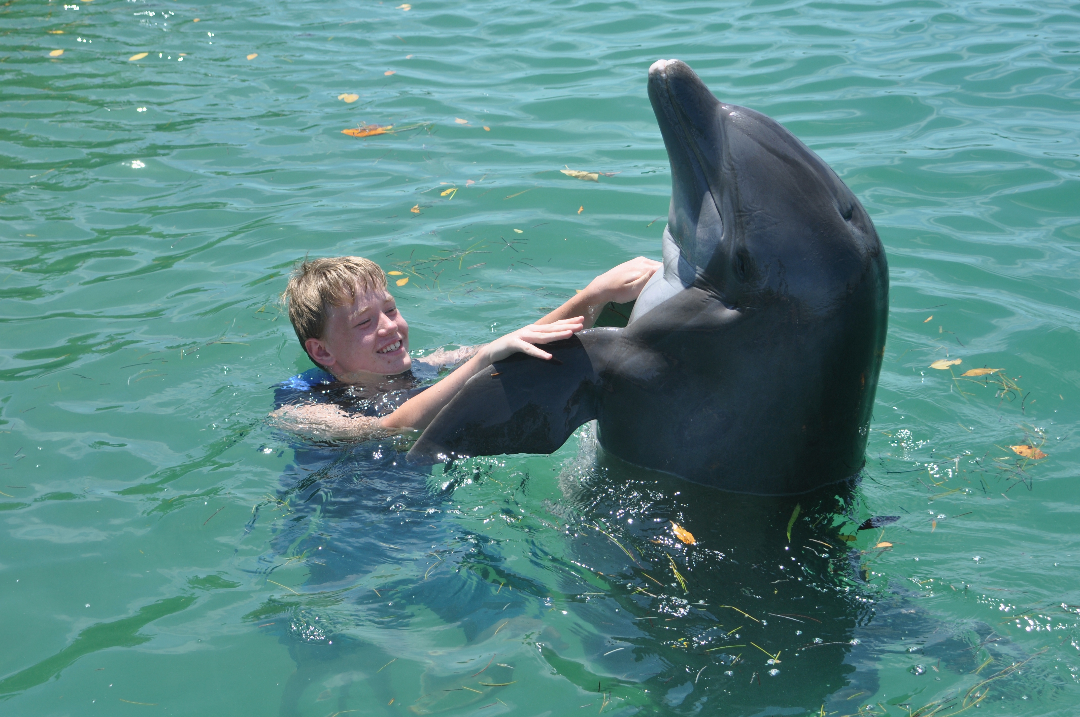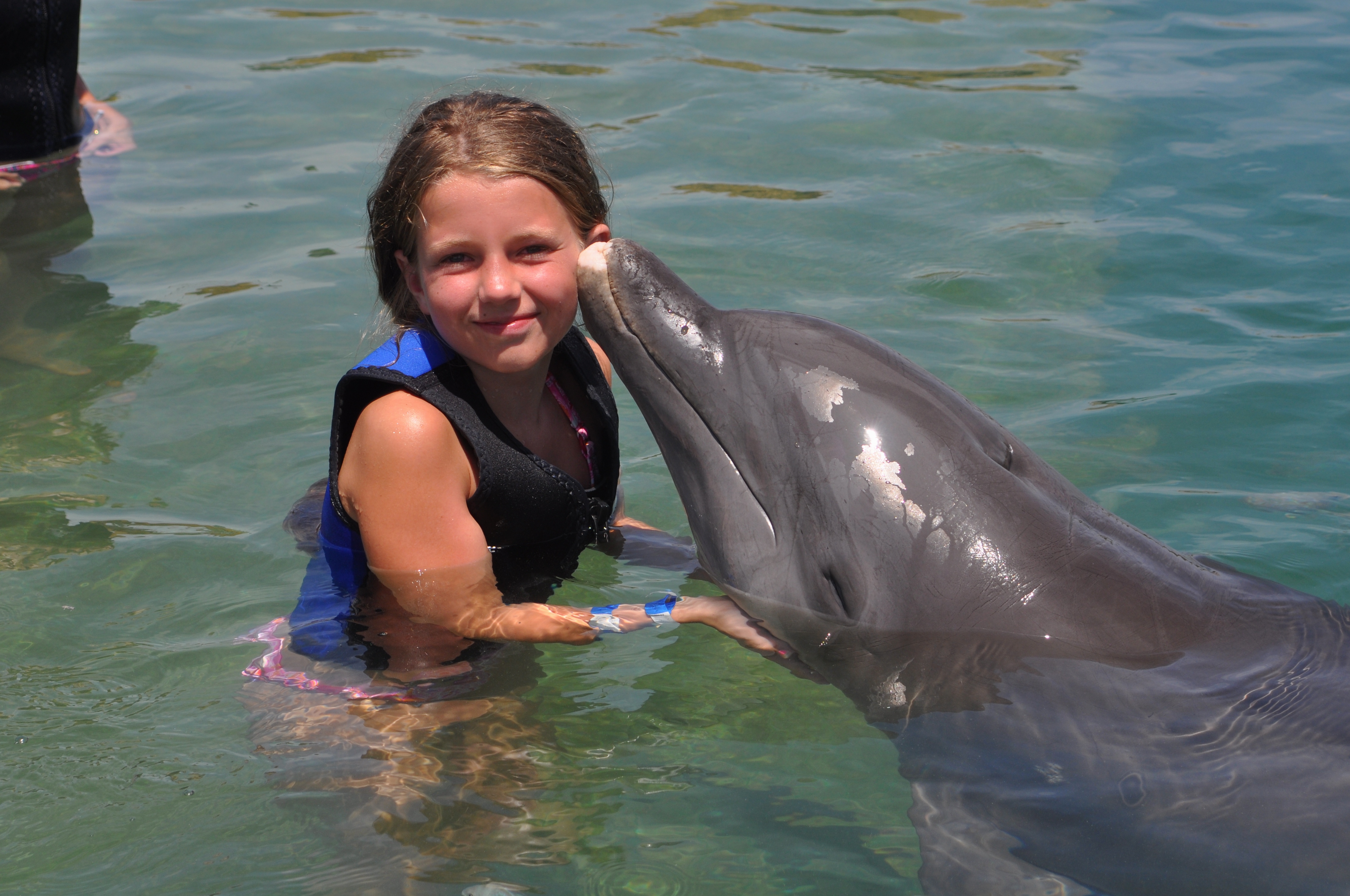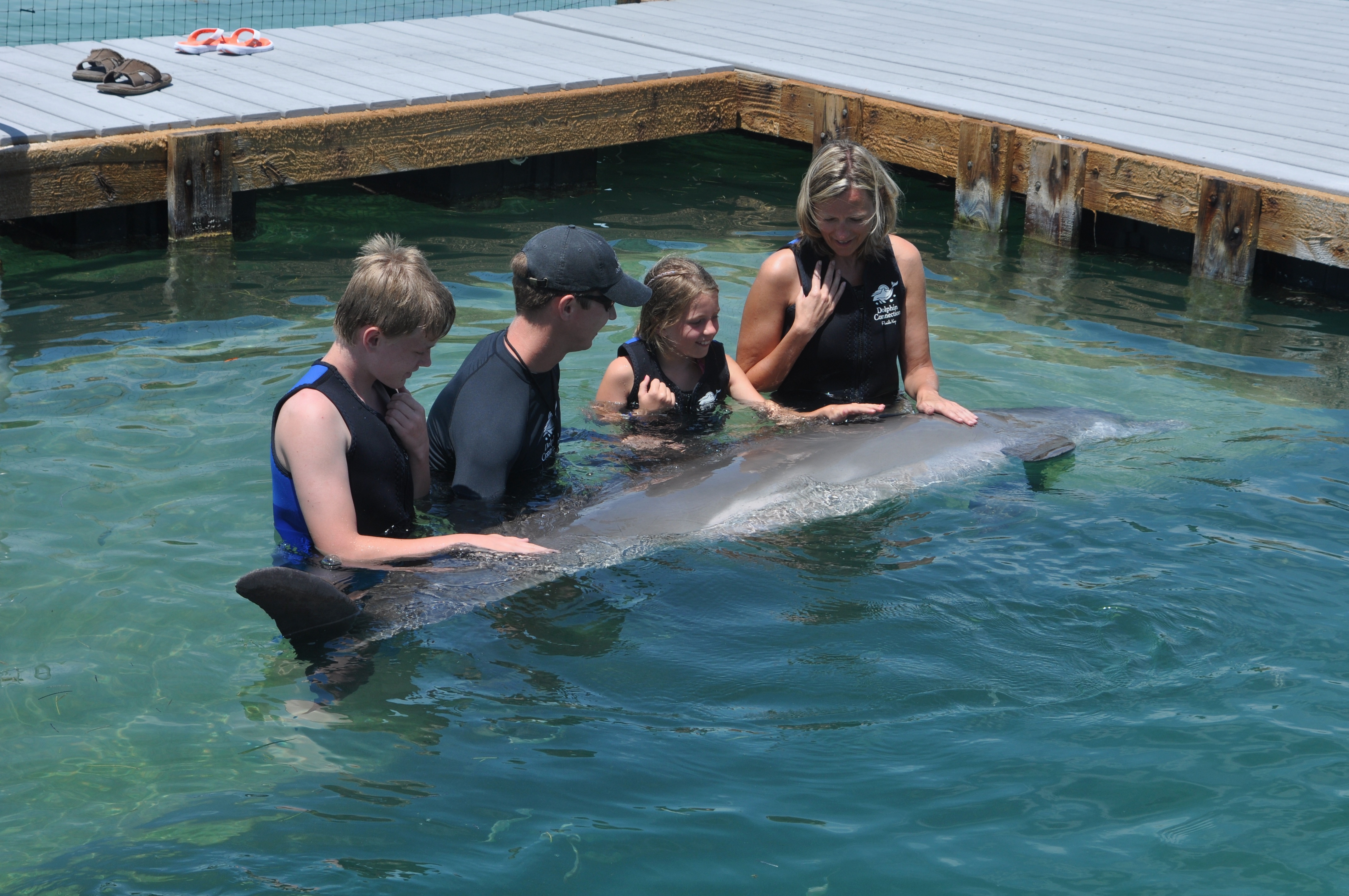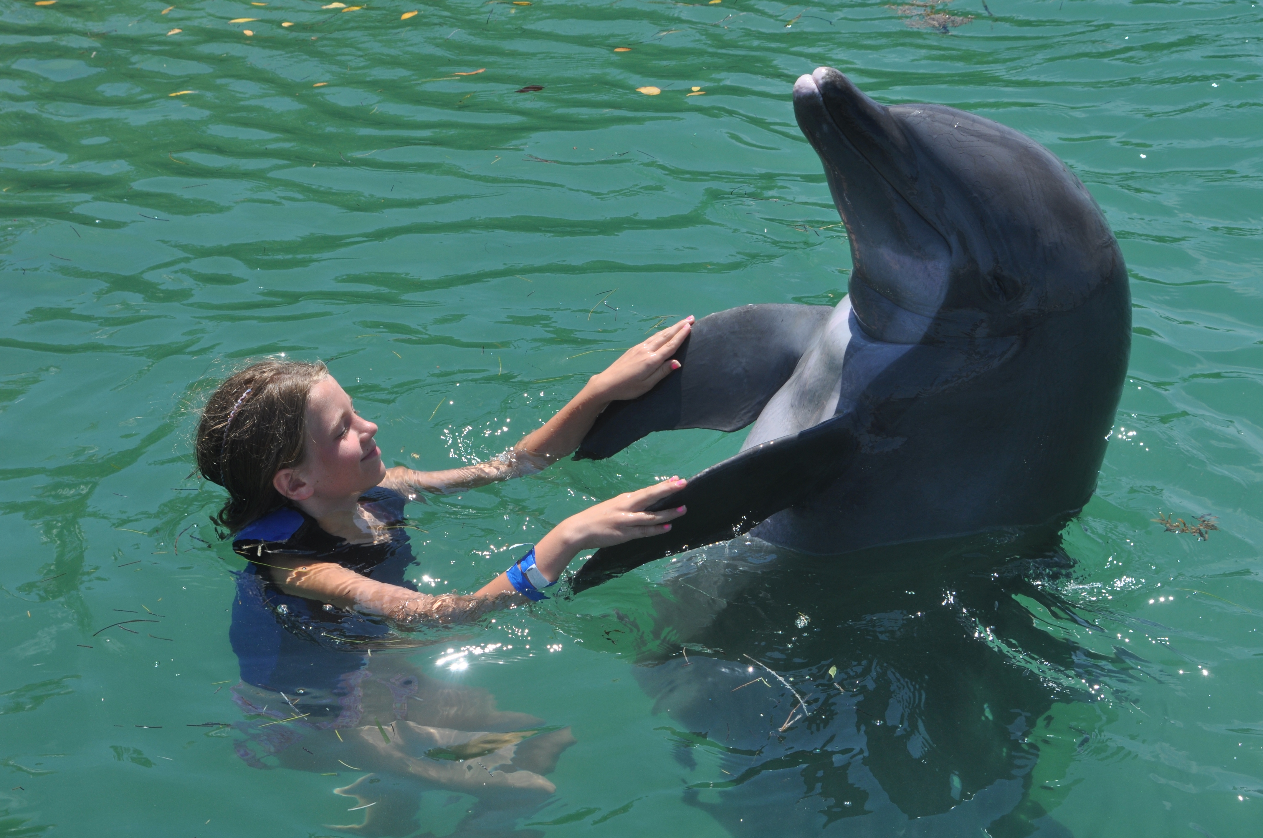 Delfinsvømming sto høyt på ønskelisten før vi dro til Florida, spesielt for frøkna på 10. På Hawks Cay var det delfinsvømming. To foreldre ble litt stressa når vi oppdaget at det var minimumskrav til høyde for å kunne hoppe i vannet med de fantastiske dyrene. Heldigvis var hun akkurat høy nok…..
