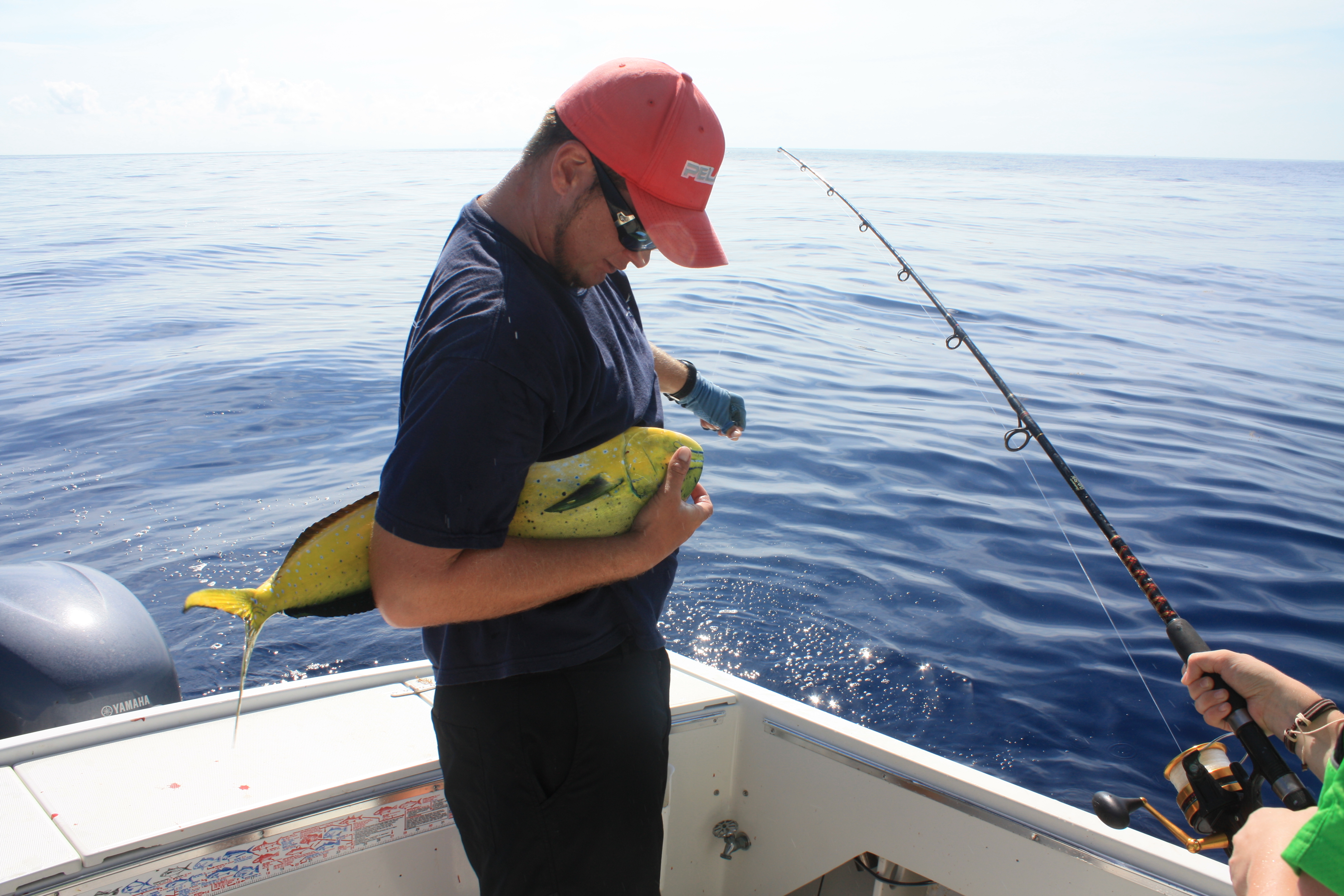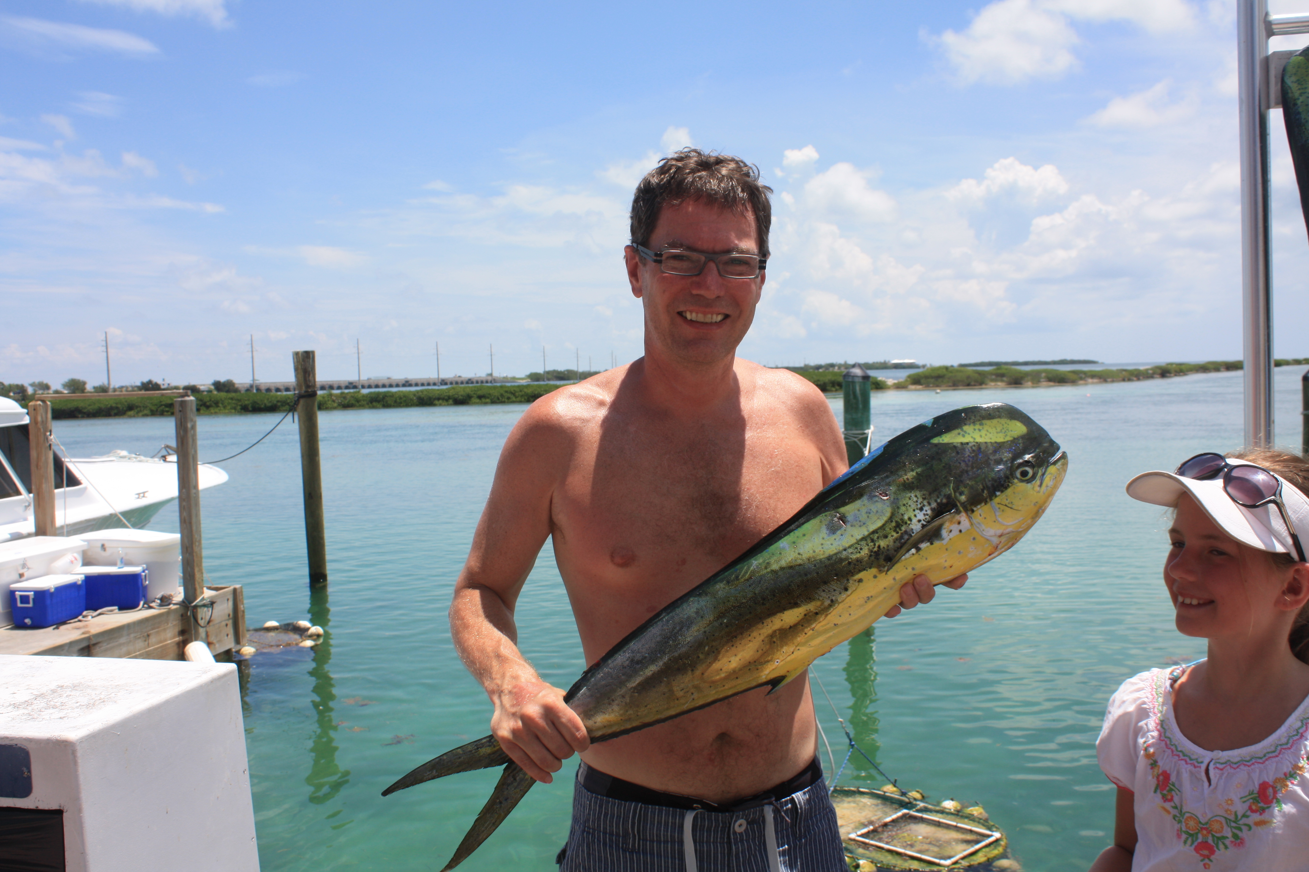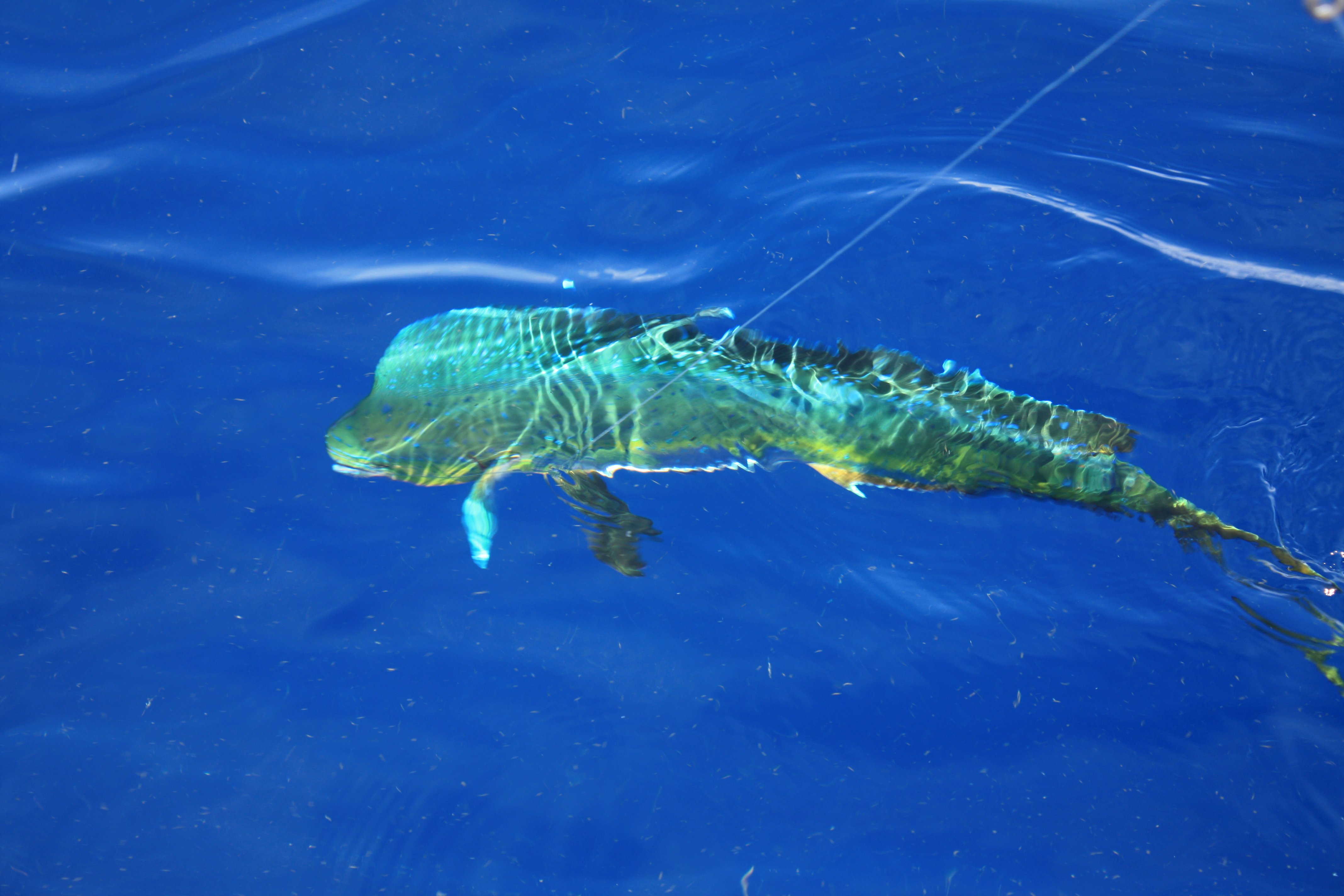 Og så hadde vi et stort ønske til…å dra på fisketur. Vi hadde nok våte drømmer om “Blue Marlin” og “Swordfish”. I juli krever dette imidlertid lange båtturer, gjerne på natten, og det passet nok ikke helt for alle i familien. Vi kom derfor til, noe som viste seg å være, et utmerket kompromiss. 4 timers Dolphin Fishing. Og “Dolphin” har ikke noe som helst med delfiner å gjøre – dette er rett og slett en helt fantastisk tropsik fisk. En “pelagic” art, dvs en fisk som lever og jakter rett under havoverflaten. Den har mange navn, Dolpinfish i Florida, Mahi-Mahi (betyr “veldig sterk”) på Hawaii, Dorado (betyr gylden) på spansk.