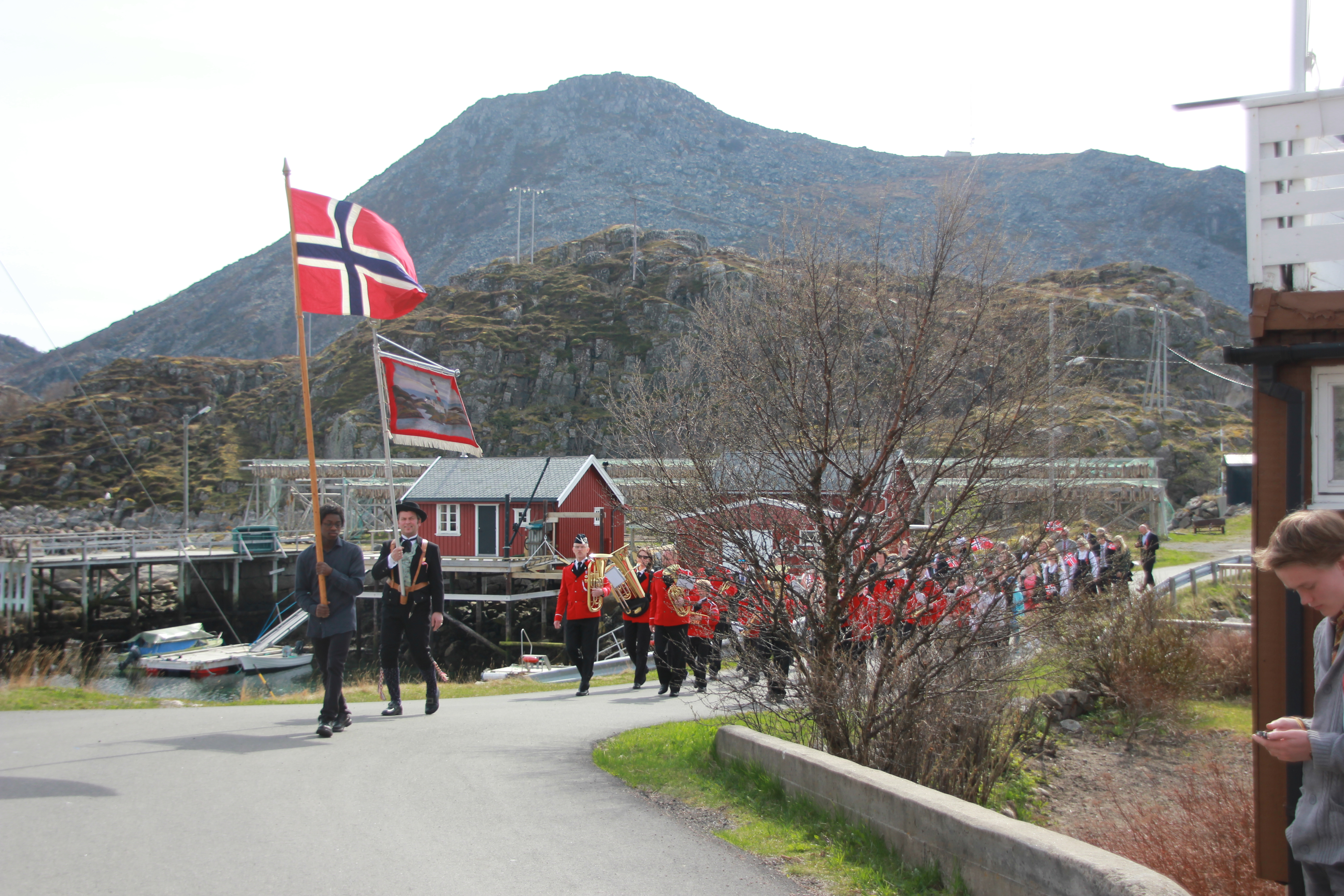 For første gang ble det 17. mai feiring så langt nord fra sentrale østlandsområder. Det var vakkert og sola sto oss bi hele dagen. Vi fikk se og høre Skrova skolekorps med snødekte fjell i bakgrunnen.
