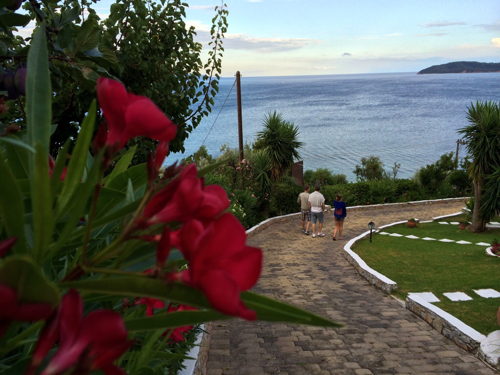 Da vi omsider ankom hotell Villa Alexis var det imidlertid vel verdt reisen! For en koselig velkomst av Alex! Og for et nydelig sted! Vi hadde bestilt to roms leilighet og den var helt super. Eget stort soverom til ungdommene, med TV:-) Hele 4 balkonger på leiligheten, hvorav 3 med “breathtaking” utsikt til havet! På kjøkkenbordet sto det også en velkomstvin fra vertskapet:-)